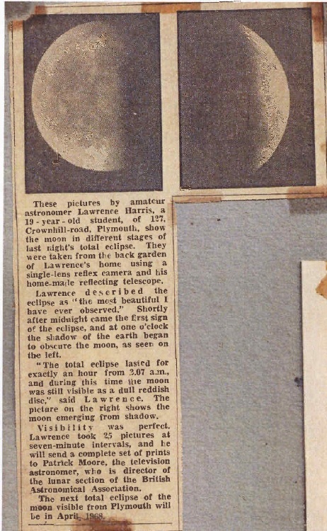 I left in 1964 to attend Plymouth College of Advanced Technology (the precursor to the university). During this time I had been able to set up my own telescope at home, an 8.25-inch Newtonian reflector and did some observing whenever possible. There was a scheduled total eclipse of the moon that December so I decided to take some pictures. On the evening before the eclipse I took some test images by simply holding my SLR camera up to the wide-angle eyepiece. I varied the exposure and rattled off a film. Next day I developed the film and was relieved to see a string of good images! We had the Herald delivered daily so I gave them a ring and told them my plans for the eclipse. Later that day they came out to take some pictures of my scope. This was rushed out the same day – the edition before the eclipse.